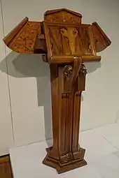 Cambelotti was born in Rome. He received a diploma in accounting, but soon after receiving it he enrolled at an applied arts education program at the Industrial Artistic Museum in Rome,[1] where he learned metal engraving. He also travelled to Naples, Athens and Istanbul to learn more.[2] He was a proponent of the ideas of William Morris, and like Morris believed in the need to restore craftsmanship and quality to visual art, ornamentation and design. Cambellotti was also drawn to the visual vocabulary of Art Nouveau. He produced illustrations in that style for magazines, books and newspapers, and his furniture design (he was known for "Cambellotti lamps" and tables) is considered emblematic of Art Nouveau concepts. His gifts were recognized and his illustrations of Dante's Divine Comedy won the Alinari Prize in 1901[3] while he was still in his twenties. He discovered theater production and set design a few years later and quickly established a name for himself in that area as well. Yet another medium he that suited his sensibility and talents was stained glass, and from 1910 into the 1920s he exhibited notable stained glass works,[3] in addition to being one of the organizers for the shows themselves.