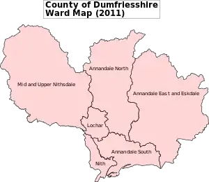 The electoral wards in the Dumfriesshire constituency are listed below. All of these wards are part of Dumfries and Galloway:[2]