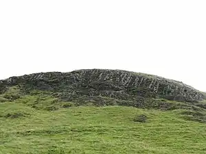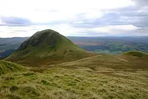Dumgoyne is a hill prominent on the edge of the Campsie Fells and is a well-known landmark visible from Glasgow. It is a volcanic plug and is 427 m (1,401 ft) high. The plug is readily reached from a path beside Glengoyne Distillery or via a water-board track from the contiguous villages of Strathblane and Blanefield 3 miles (5 kilometres) to the east or Killearn to the west.