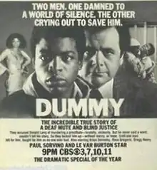 Dummy is a 1979 American made-for-television docudrama film starring LeVar Burton and Paul Sorvino.[1] Based on Ernest Tidyman's nonfiction book of the same name, the film dramatizes the life of Donald Lang (portrayed by Burton), an African–American deaf man who was acquitted of the murders of two prostitutes in Chicago, Illinois.[2]