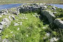 The circular interior of the broch was in the Middle Ages transformed into a rectangular area 10 metres by 4.6 metres.[2] The axis is northeast–southwest. The entrances are 1.1 metres wide, located in the northwest and southwest of the rectangular space.[2] The wall at the southwestern entrance is 2.5 metres thick.[2]