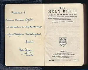 - 24 November 1940: Christening of William Duncan [born in East Dundry] at St James Presbyterian Church, The Barton, Bristol. ... Church completely burned out that night. ... This evening a tremendous air raid began about 6pm – ended about midnight – Bristol was demolished in parts and fires started over a tremendously wide area [148 long-range bombers of Luftwaffe 3[10]]. Glare in the sky reflected on hillside opposite the house [The Dingle, now Dingle House]. Shrapnel fell around the house, but vibration from bombs felt very little here – nearest ones fell North Wick, top fields near Knights [Walnut Farm], Bishopsworth etc. Next day roads partly closed for time bombs. L in Bristol and returned with tales of devastation and the amazingly good organisation and firefighting services."