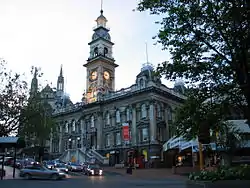 The Dunedin Town Hall, also known as the Dunedin Centre, is a municipal building in the city of Dunedin in New Zealand. It is located in the heart of the city extending from The Octagon, the central plaza, to Moray Place through a whole city block. It is the seat of the Dunedin City Council, providing its formal meeting chamber, as well as a large auditorium and a conference centre. The oldest part of the building has been called the only substantial Victorian town hall still in existence in New Zealand.[1]