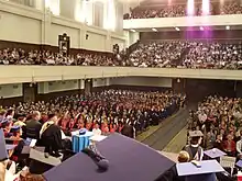 The First World War delayed progress, and in the early 1920s ratepayers voted against raising a loan to pay for the building. The city council's profits from its trading departments during the 1925-1926 New Zealand and South Seas International Exhibition enabled it to undertake the project and pay for it with cash. The plans were now modified explicitly by Mandeno's new partner Roy Fraser.[14] Among other changes, the floor of the Concert Hall was lowered below that of the main auditorium and also below the first floor of the Municipal Chambers, thus placing a barrier between them. This impeded Lawson's intended entry from the Octagon to the spaces behind the Municipal Chambers, and generally made movement through the whole extended complex difficult.[15] The foundation stone was laid on 3 March 1928 and the building was opened on 15 February 1930. The main auditorium was then, and remains, the largest in New Zealand.