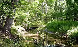 Dunes Creek sources west of Interstate 49 and south of U.S. Highway 20 and flows northward receiving first the Great Marsh tributary from the east then the West Branch tributary which drains Cowles Bog. The 7,407 acres (2,998 hectares) (2997-hectare) Dunes Creek watershed extends from the Mittal Steel (formerly Bethlehem and ISG Steel) plant in Portage in the west to Beverly Shores in the east.[5] Originally, Dunes Creek included much of Michigan City.[6] Dunes Creek is one of three perennial streams which flow from the Great Marsh system into Lake Michigan.[7] The other two streams are man-made ditches to the east of the Dunes Creek watershed which were cut through the dunes to provide for farming, industrial use, and housing. These ditches divided the eastern Dunes Creek watershed and created the new subwatersheds of Kintzele Ditch[8] and Derby Creek. Beginning in 1998, the national lakeshore began restoration of the Great Marsh by closing Derby Ditch and restoring 500 acres (200 ha).[9]