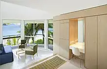 The damage to the resort was described as being very severe, with much of the resort needing to be completely rebuilt. The usually cyclone-hardy palm trees were stripped.[42] The resort's pool was filled with sand from the storm surge, the function hall was gutted, and the health centre was unroofed. Almost all of the beachfront apartments had their walls torn off.[43] The gardens of the resort were stripped bare.