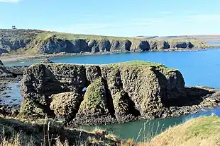 Sited between Stonehaven and the similarly situated Dunnottar Castle, the sea stack is in Strathlethan Bay, with Downie Point to the north and just offshore from the cliffs at Bowdun Head to the south. It is cut off from the mainland at high tide and the flat, grassy summit is entirely surrounded by precipitous cliffs some 30–35 metres (100–115 ft) high.[1][2] The conglomerate rock is lower Old Red Sandstone.[3] At the time of the hill fort the location may have been a promontory and subsequent erosion of the cliffs has turned it into a stack with a summit plateau about 20 by 12 metres (66 ft × 39 ft), much smaller than it was in Pictish times.[4][5][6]