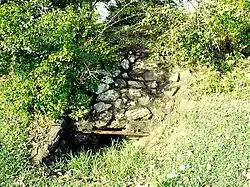 It is believed that the foundations of the compound may still be interpreted through careful archaeological excavation and examination. The remains of the privy pit are also not extensive. It is reported that the position of the pit may be marked by a slight depression in the soils surface. From this location the pit drops down about 2.2 metres (7 ft 3 in) to a horizontal tunnel which runs approximately 3–3.5 metres (9.8–11.5 ft) before reaching the opening in the bank.[1]
