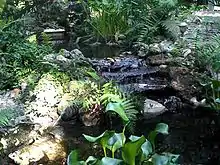 A 1948 American Automobile Association publication described the 900-acre estate as including "a beautiful 25-acre tropical garden with winding paths, meandering streams and sparkling waterfalls" and called it "one of Florida's major attractions".[2] The gardens were also featured in other late 1940s and early 1950s guides.[3][4][5] A historical marker, now located at the edge of a suburban housing development on Ehren Cutoff (Pasco CR 583), marks the original entrance of the road that once led to the 25-acre tropical botanical garden. The original stone ticket gate has been left standing.