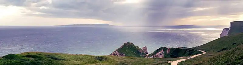 In Man O' War Bay, the small bay immediately east of Durdle Door, the band of Portland and Purbeck limestone has not been entirely eroded and is visible above the waves as Man O'War Rocks.[10] Similarly, offshore to the west, the eroded limestone outcrop forms a line of small rocky islets called (from east to west) The Bull, The Blind Cow, The Cow, and The Calf.[10]