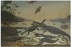 A print also apparently reached Georg August Goldfuss, as in 1831 he included a similar drawing, clearly influenced by De la Beche's work, of a scene out of the Jurassic based on fossils from the Jura Mountains in the latest chapter of the serial publication of his Fossils of Germany. Buckland wrote to De la Beche urging him to create more scenes before the Germans used up all the best ideas. De la Beche didn't produce any other scenes on such a scale, but he did include several much smaller and simpler scenes of prehistoric life in the second edition of his Geological Manual (1832). Such scenes didn't remain confined to scientific circles. In 1833 the geologist John Phillips produced a wood cut of an elaborate prehistoric scene, that was obviously influenced by Duria Antiquior and Goldfuss's Jurassic scene, for publication in the popular Penny Magazine, and another illustration which borrowed elements from Duria Antiquior appeared in a French illustrated dictionary of natural history in 1834.[9] Such scenes from deep time vividly illustrated advances in palaeontology, and helped convince scholars and even the general public that the deep past could be understood with a reasonable degree of confidence.[10]
