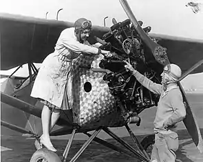 In 1929, the editor of the San Diego Sun announced a contest to encourage women's participation in aviation – the winner of the “Miss Air Capital of the West” contest would receive a free full course of instruction at the Ryan Flying School at a (1929) value of about $1,300.[3] The contest consisted of a series of tests to determine the greatest advance over a period of time in the study and practice of aviation.[4] When the judges made their final decision, Peaches Wallace placed first with a score of 85.48.[5][6] The flying instructions began on September 3, 1929, at Ryan Airport (Dutch Flats).[6][7] In 1929, pioneer aviatrix Ruth Alexander, a graduate of the Ryan Flying School, established a new world record for women in light aircraft on a flight from Dutch Flats Airport. A post office now located on the site contains several historic plaques commemorating Dutch Flats and Lindbergh.[2]