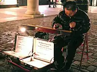 The duxianqin is played using harmonics, with the string's tension varied by the use of a flexible rod. The string is plucked with the right hand, and the pitch is simultaneously controlled with the left hand by moving the rod to adjust the tension on the string.[2] Depending on the direction that the rod is turned, either toward or away from the player, it will bend the pitch of the string to higher or lower notes.[3]