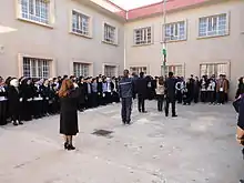 Every Saturday in this gym three students raise the Flag of Kurdistan and the principal with physical education teacher perform the raising of the flag, with performing the Kurdish National Anthem[2] Ey Reqîb, the picture shows raising of the flag at the gym in 2013 and 2014.