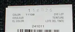 A dye lot is a record taken during the dyeing of yarn to identify yarn that received its coloration in the same vat at the same time. Yarn manufacturers assign each lot a unique identification number and stamp it on the label before shipping. Slight differences in temperature, dyeing time, and other factors can result in different shades of the same color between different dye lots of otherwise identical production. Although the component elements of a dye lot number are of interest only for internal business recordkeeping, retail yarn consumers have an interest in ensuring that they purchase a given color of yarn from identical dye lots.[1]