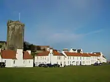 The whole of Dysart is a conservation area. This was designated by the former Kirkcaldy District Council (KDC) on 8 May 1978. Dysart Tolbooth on the High Street, erected in 1576, is the centrepiece of Dysart's historic buildings. This was once used as a public weigh-in and measures house; guards house and eventually a prison built as an extension in 1617.[25][27][28] The building was also known to keep explosives. When this was occupied by Oliver Cromwell's troops in 1651, one of them accidentally dropped a match into a barrel of gunpowder (which was abandoned by a Dysart merchant) causing the roof to be blown apart.[29][30] The upper part of the building was rebuilt between 1733 and 1734 with an ashlar bell-chamber and a stone ogile roof.[27][31] The neighbouring Dysart Town Hall was once used as the meeting place for the provost and town council.[30]