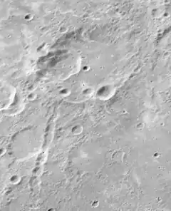 ![]() Oblique Apollo 16 mapping camera image Dziewulski crater is at top, Catena Dziewulski is linear feature at lower left | |