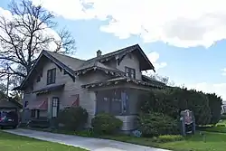 The E.F. Hunt House in Meridian, Idaho, USA, is a 1½-story Craftsman bungalow designed by Tourtellotte & Hummel and constructed in 1913. The house has an unusual roof design, with a lateral ridgebeam extending beyond left and right gables, hip roofs on either side of a prominent, front facing gable, and a lower hip roof above a cross facade porch. Double notch rafters project from lateral eaves and from cantilevered window bays with shed roofs below the side facing gables. Narrow clapboard siding covers exterior walls. The front porch is supported by square posts with geometric, dropped caps. Tourtellotte & Hummel had used the square post decorations in other Bungalow houses, and a more elaborate example is found on the porch of the William Sidenfaden House (1912) in Boise. The house was added to the National Register of Historic Places in 1982.[2]