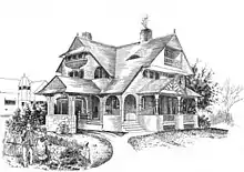 Gustav Stickley promoted the Arts and Crafts movement in the United States through his furniture designs and by founding The Craftsman magazine in October 1901.[11] The Arts and Crafts ideals of unnecessary ornament; local, natural materials; and fine workmanship were a natural fit with Dietrich's own ideals and design style. In the February and April 1903 editions of The Craftsman, Dietrich's "The Cottage Quality" presented views, floorplans, and an essay describing the virtues and thoughts behind his design.[12][13] Then in May 1903, the magazine published the first "Craftsman House" a design by Dietrich in cooperation with Stickley.[2] Featuring an essay and drawings by Dietrich including an exterior view, floor plans, and detailed interior views showcasing Stickley furniture, this was the first time this term had been used in the magazine and was the precursor to the "Craftsman Homes" series starting in 1904.