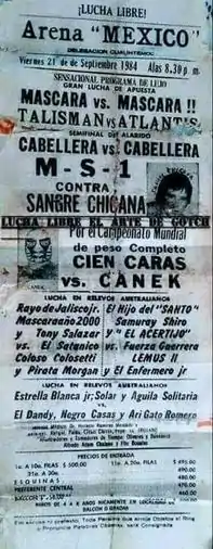 - 1 2 3 4 Atlantis CMLL (September 21, 2019). "Mi primera lucha de máscara vs máscara en el año 1984" (in Spanish). Retrieved September 21, 2019.