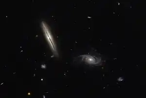 The discovery of these giant jets in 2003, not visible in this image,[6] but indicated in this earlier Hubble composite,[7] has been followed by the unearthing of a further three spiral galaxies containing radio-emitting jets in recent years.[2][8] This growing class of unusual spirals continues to raise significant questions about how jets are produced within galaxies, and how they are thrown out into the cosmos.[3][9]