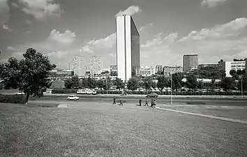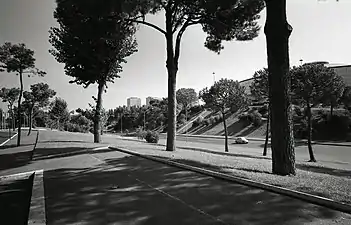 During World War II the uncompleted EUR development suffered severe damage.[5] However, the Roman authorities decided that EUR could be the basis of an out-of-town business district, which other capitals did not begin planning until decades later (for example, London Docklands and La Défense near Paris). During the 1950s and 1960s the unfinished Fascist-era buildings were completed and other new buildings were built in contemporary styles for use as offices and government buildings, set in large gardens and parks.