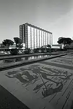 In 1938 Luigi Moretti (with Fariello, Muratori and Quaroni) won the competition for the design of the Imperial Square (now Piazza Guglielmo Marconi). The large building fronting the square was never finished, but after the war the structures already constructed were used for the "Skyscraper Italy (Grattacielo Italia)" by Luigi Mattioni.