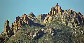 Eagle Crags is situated 2.5 mi (4.0 km) southeast of Rockville and 2.5 miles south of Zion National Park, and can be seen from Utah State Route 9. Topographic relief is significant as it rises 2,800-foot (850-meter) in two miles on its north side above the Virgin River which drains precipitation runoff from this mountain. Its nearest higher neighbor is Lower Mountain, 2 mi (3.2 km) to the south, Shunesburg Mountain is four miles to the northeast, and Smithsonian Butte is four miles to the west-southwest. The uppermost part of this mountain is composed of light-colored Jurassic Navajo Sandstone which overlays the deep-red sandstone of the Kayenta Formation. Access is via the 2.8 mile Eagle Crags Trail which passes through pinyon–juniper woodland, sagebrush, blackbrush, yucca, and cacti as it gains 900 feet of elevation to the base of the sandstone pinnacles, spires, and crags.[3] Views from the trail include Mount Kinesava, Johnson Mountain, and other landmarks within Zion National Park.[4] This geographical feature's name was officially adopted in 1934 by the U.S. Board on Geographic Names.[2]