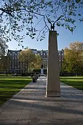The Eagle Squadrons Memorial is a Second World War memorial in Grosvenor Square, London. It commemorates the service of the three Royal Air Force Eagle Squadrons from 1940 to 1942, during the Battle of Britain, and in particular their 244 Americans and 16 British fighter pilots, of whom 71 were killed. The bronze sculpture of an eagle which tops the memorial is by Elisabeth Frink.