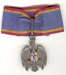 The Honorific Sign "Eagle of Romania" (Semnul Onorific "Vulturul României") is a special decoration, part of the National Decorations System, awarded to Romanian Parliamentarians, members of the Senate or of the Chamber of Deputies. It also can be awarded to foreign parliamentarians for its special contribution in the development of parliamentarian relations with Romania.[1][2]