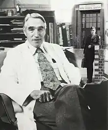 ![]() Earl Wood in his office at the Mayo Clinic with an inset photo from 1946 showing him in Heidelberg, as part of Operation Paperclip, seeking to recruit German scientists to work in the United States. | |