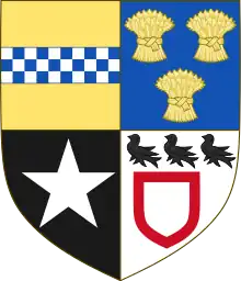 • Arms: Quarterly: 1st, Or a Fess chequy Argent and Azure (Stewart); 2nd, Azure three Garbs Or (Buchan); 3rd, Sable a Mullet Argent (Traquair); 4th, Argent an Orle Gules in chief three Martlets Sable beaked of the second (Rutherford).