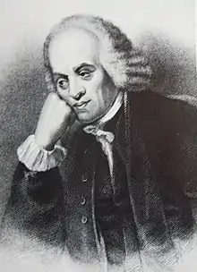 Johnson's future now began to look uncertain, as his father was deeply in debt.[38] To earn money, Johnson stitched books for his father, although poor eyesight—a result of his childhood illness—meant he eschewed the work involved. It is possible that Johnson spent most of his time in his father's bookshop reading various works and building his literary knowledge. During this time, Johnson met Gilbert Walmesley, the Registrar of the Ecclesiastical Court and a frequent visitor to the bookshop.[39] Walmesley took a liking to Johnson, and the two discussed various intellectual topics during the two years Johnson spent working in the shop.[40] Their relationship was soon put on hold; Sarah Johnson's cousin, Elizabeth Harriotts, died in February 1728 and left her £40 (about £5,800 as of 2023), which was used to send Johnson back to school.[41][42]