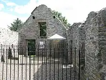 The roofless church sits on a small rise and is surrounded by a burial ground. It can be found near the village of Eassie in Angus Scotland. The building is rectangular in design, measuring 17.2 m (56 ft) x 4.7 m (15 ft). Surviving in its original layout, it was mostly rebuilt in the late 16th century.[1] The northern and southern walls survive to a height of 2.0 m (6 ft 7 in), the gables are original and the walls are 0.8 m (2 ft 7 in) thick. The west doorway in the south wall is 18th century, but the eastern doorway is original.[2]