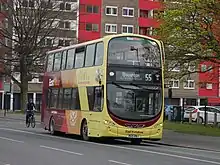 The 55 runs on Mondays to Saturdays from Hull Paragon Interchange to Gilberdyke and Goole, running parallel to the A63 and the M62 motorway and serving the communities of North Ferriby and South Ferriby, Brough, Elloughton, North Cave and South Cave, with the two-hourly extension to Goole also serving Howden.[17] The service was launched in January 2021, replacing the 155,[18][6] and is operated mainly using a fleet of refurbished Wright Eclipse Gemini 2 bodied Volvo B9TL double-deckers.