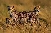 In 2007, the total number of cheetahs in East Africa were estimated at 1,960 to 2,572 adults and independent adolescents. East African cheetahs form the second-largest population after the Southern African cheetah. In 2007, there were between 569 and 1,007 cheetahs in Tanzania, between 710 and 793 cheetahs in Kenya, between 40 and 295 cheetahs in Uganda and approximately 200 left in Somalia.[4] Kenya is the main stronghold for the East African cheetah, with the largest population of 800 to 1,200 adults in the country since 2015.[5] In 2016, it was estimated that more than 1,000 individuals are resident in the Serengeti/Maasai Mara ecosystem of Tanzania and Kenya.[6]