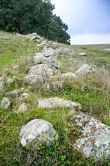 The East Bay Walls, also known as the Berkeley Mystery Walls, are a misnomer, as many such walls can be found throughout the hills surrounding the San Francisco Bay Area, and extend as far as Chico and Red Bluff. In places, they are up to a meter high and a meter wide and are built without mortar.[1] The walls extend anywhere from a few meters to over a half mile. Materials range in size from basketball-size to sandstone boulders weighing a ton or more. Parts of the wall seem to be just piles of rocks, while other walls were carefully constructed. The exact age of the walls is unknown. Many formations have sunk far into the earth, and are often completely overgrown.