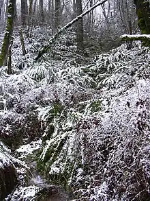 The Gresham Butte Saddle Trail runs through open space owned by Metro and the City of Gresham. The trail was previously a logging road and is bordered on the north by Gresham Butte and on the south by Towle Butte and Gabbert Hill. Several tributaries of Johnson Creek are located in this open space. The land in this area is dominated by black cottonwood, red alder, and Douglas-fir. There are also many non-native species present, such as Himalayan blackberry and European holly, a large stand of which is found around the middle of Saddle Trail. Somewhere in the forest is an old bus used to move water pipes for the planned Mount Hood Freeway. The project and the bus were abandoned in the 1970s after a mass public outcry against the proposed freeway.