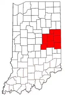 East Central Indiana is a region in Indiana east of Indianapolis, Indiana, and borders the Ohio state line. The Indiana Gas Boom, which took place during the 1890s, changed much of the area from small agricultural communities to larger cities with economies that included manufacturing. Companies such as Ball Corporation and Overhead Door once had their headquarters in the region. Glass manufacturing was the first industry to be widespread in the area, because of the natural gas. As the glass industry faded, many of the skilled workers became employed at auto parts factories in cities such as Muncie and Anderson. With the decline of the American automobile industry, East Central Indiana became part of the Rust Belt. Many communities have been forced to reinvent themselves with a focus on services or a return to agriculture.