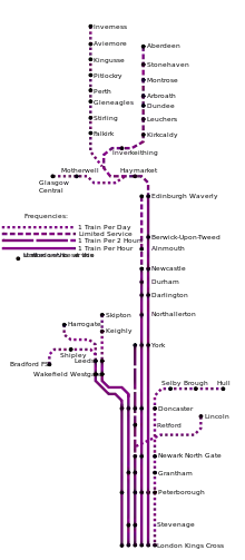 This was East Coast's flagship route, serving the whole length of the East Coast Main Line; an hourly service from London to Edinburgh Waverley, calling at York, Darlington, Newcastle, Berwick-upon-Tweed and Edinburgh. Some of these trains also called at Peterborough. Occasionally there was a half-hourly service to Edinburgh with some Newcastle trains extended at peak hours. At weekends all services on the half-hour continued to Edinburgh from Newcastle.[35]