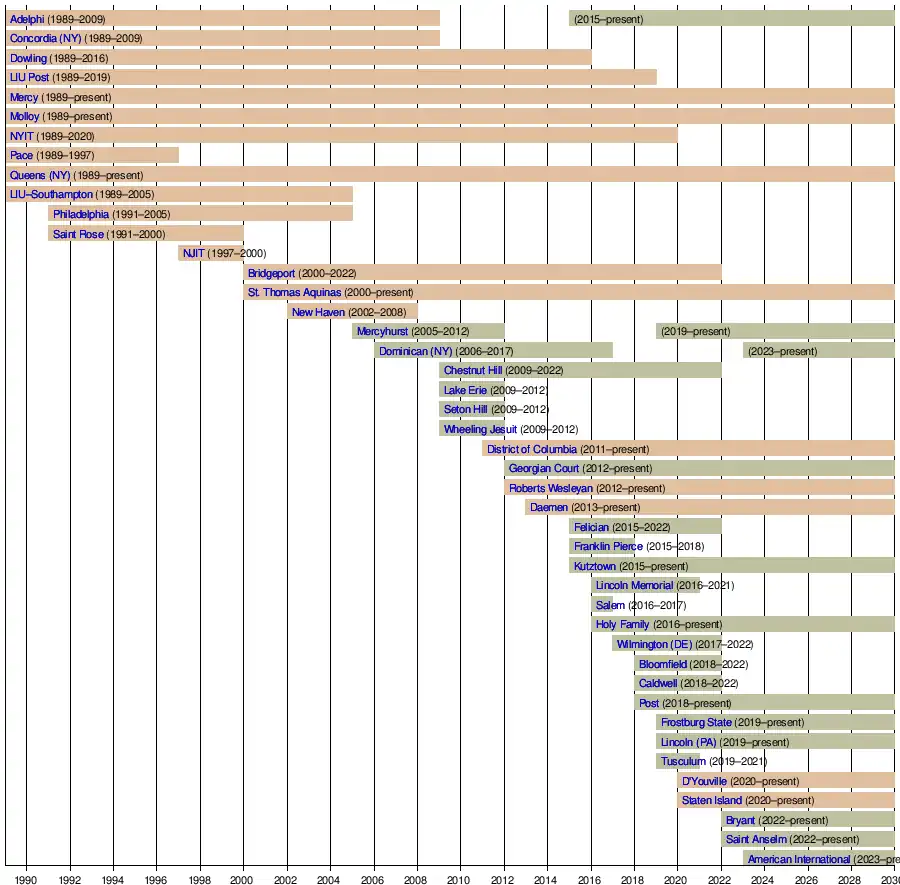 Other members that joined were: University of Bridgeport (2000–2022), University of New Haven (2002–2008), New Jersey Institute of Technology (NJIT) (1997–2000), Philadelphia University (1991–2005), College of Saint Rose (1991–2000), St. Thomas Aquinas College (2000–present), University of the District of Columbia (2011–present), Roberts Wesleyan University (2012–present), Daemen University (2013–present), D'Youville University (2020–present) and College of Staten Island (2020–present).