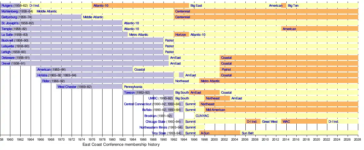 The East Coast Conference was an college athletic conference at the Division I of the National Collegiate Athletic Association (NCAA). It was founded as the university division of the Middle Atlantic Conferences (MAC) in 1958. The MAC consisted of over 30 teams at that time, making it impossible to organize full league schedules in sports like football, basketball, and baseball. In 1958, the larger schools created their own mini conference, consisting of 11 members (7 for football).