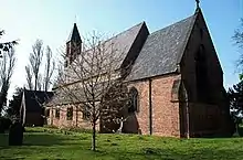 The parish church of Holy Trinity was built by Charles Ward of Lincoln between 1853 and 1854, to a design by William Butterfield. The work was commissioned by the William Dawnay, 7th Viscount Downe, and the west end is thought to be modelled on the church at Lindisfarne (Holy Island) in Northumberland. It is now a Grade II listed building.[1] Dawnay's commission also included the vicarage[2] and the Church of England primary school, together with its schoolhouse, all of which are Grade II listed. Similar clusters of buildings were erected at Hensall and Pollington.[3]
