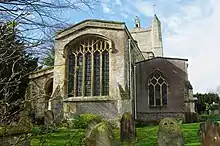 Nikolaus Pevsner takes this to mean that the north chapel was built early in the 15th century, which surprised him as its Decorated Gothic style had been succeeded by Perpendicular Gothic around 1350.[3] However, the south aisle and south chapel were rebuilt in the Perpendicular Gothic style early in the 15th century so Page and Ditchfield conclude that the brasses of Clarice Windsor and John York were formerly in the south chapel and moved at a later date.[3] The south chapel has a squint into the chancel.[2] The chapel was re-roofed in the 17th century.[3] The arch supporting the west bell tower is 14th-century Decorated Gothic but the style of the rest of the tower is Perpendicular Gothic.[2][3] A Perpendicular Gothic clerestory was added to the nave in the 15th century. The east window of the chancel is also Perpendicular, from late in the 15th century.[2] St Andrew's is a Grade I listed building.