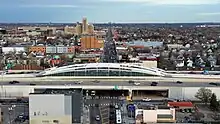 Lake Street looking east from Nicollet Ave with Interstate 35W in the foreground and the Midtown Exchange visible in the background.