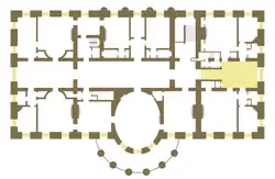 The room is entered from the second floor corridor on the west side of the room. A large fanlight window on the east side of the room faces the Jacqueline Kennedy Garden, the East Colonnade, the East Wing, and the U.S. Treasury. Two disguised doors allow access to a closet and a staircase up to the third floor.