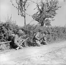 Armstrong remained in command until April 1942 when he was posted to command the 70th (Young Soldiers) Battalion.[49][55] Lt Col H.A.B. Bruno took command in April 1942 and led the battalion in action in North Africa in March, but was killed in action during the attack on Djebel Djaffa in April.[56] He was succeeded by Lt Col R O V Thompson, who had served with the 1st and 2nd Battalions before the war, appointed from a posting in the RAF to command the 1/6th for the final phase of the Tunisian Campaign. He subsequently led the battalion into action in Italy in the crossing of the River Rapido and the capture of Cassino. He, too was killed in action when his Jeep was blown up by a mine near Tivoli on 7 June 1944.[57] Colonel C G S McAlester took command until February 1945.[58] For the final months of the war, until August 1945, the battalion was led by Lt Col A G H Culverhouse, who had previously served with the 1/6th and had been wounded at Dunkirk.[59][60]