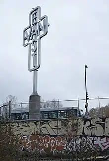 Starting in the 21st century, the symbol has been adopted as a city icon, most visibly expressed in the form of Monument for East Vancouver by artist Ken Lum, erected in 2010 near the intersection of Clark Drive and East 6th Avenue.[3] It has become possible to purchase clothing[4] and jewellery bearing the East Van Cross motif.[5]