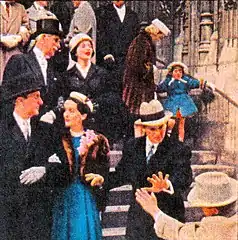 The Bynoes exit the church in the company of another man. Tabby tries to grab the orchids but the Bynoes' companion wards him off. So Tabby ducks away into the crowd and begins to stalk them as the three walk up the avenue. Archie has been able to capture much of the action on film.