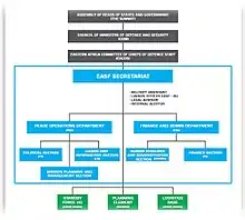EASFSEC is led by a Director and the Heads of Departments (Finance & Administration and Peace Operations Department). These are appointed by the Council of Ministers of Defense and Security.[8] Since April 2017, Dr. Abdillahi Omar Bouh from the Republic of Djibouti is currently serving as the fifth Director of EASF.[9] He was preceded by Amb Chanfi Issimail from the Union of Comoros. Before Amb Chanfi was Mr. Maj-Gen (Rtd) Cyrille Ndayirukiye (Burundi, 3rd), Col Peter Marwa (Kenya, 2nd) and Mr. Simon Mulongo (1st).[10] The management is assisted by a Legal Advisor, Military Advisor, Internal Auditor and an AU Liaison Officer.